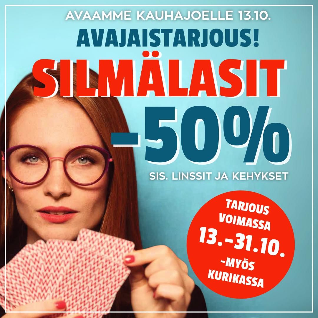 Avajaistarjous! Avaamme uuden myymälän Kauhajoelle 13.10. klo 9.00. Avajaistarjous silmälasit -50% (sis.linssit ja kehykset). Tarjous voimassa myös Kurikan myymälässä. Meillä voit maksaa ostoksesi erissä laskulla ja sinulle sopivissa erissä. Silmälasitilillä saat 12 kuukautta korotonta maksuaikaa. Luotonantaja on Resurs Bank. Tarjous voimassa 31.10. saakka.